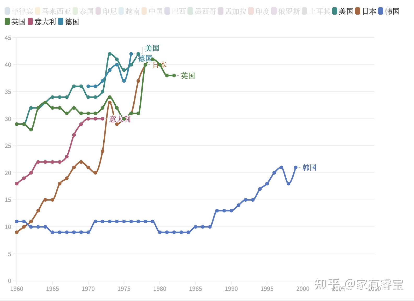 如果再比較主要發達經濟體,那收入倍增基本上無望。下圖是美日德英意韓六國的倍增曲線。