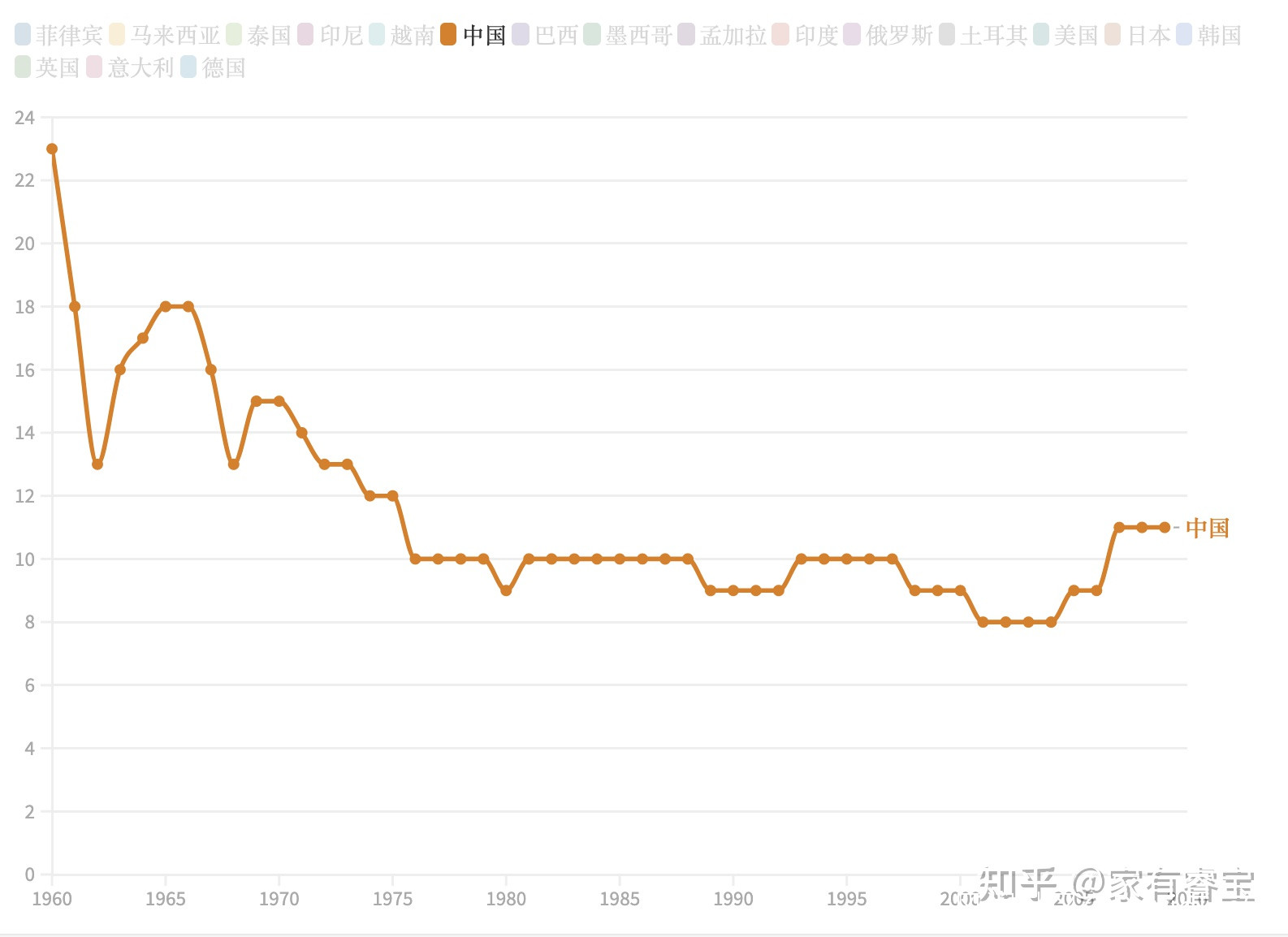 從上面的數據來看,是不是很多人覺得中國收入倍增的速度有點慢?實際上如果橫向一對比,就會發現中國的倍增速度可以用“神速力”來形容,許多國家(特別是發達國家)已經有幾十年未能實現收入倍增了。