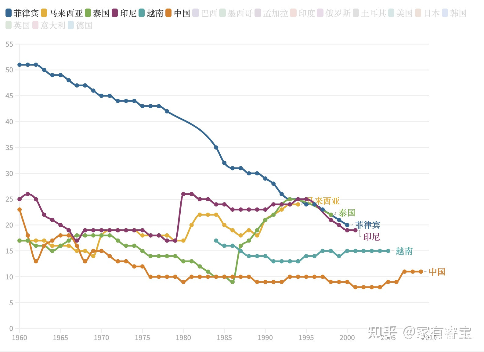 我們來看東南亞五國的收入倍增曲線。