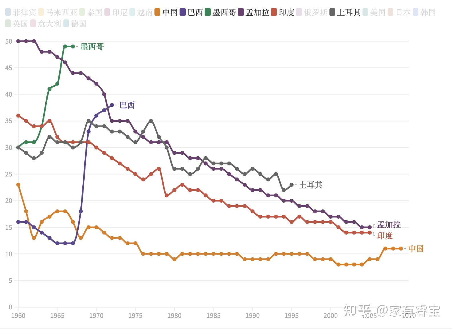 我們再看一下其它主要人口大國的倍增曲線(巴西、墨西哥、孟加拉、印度和土耳其)