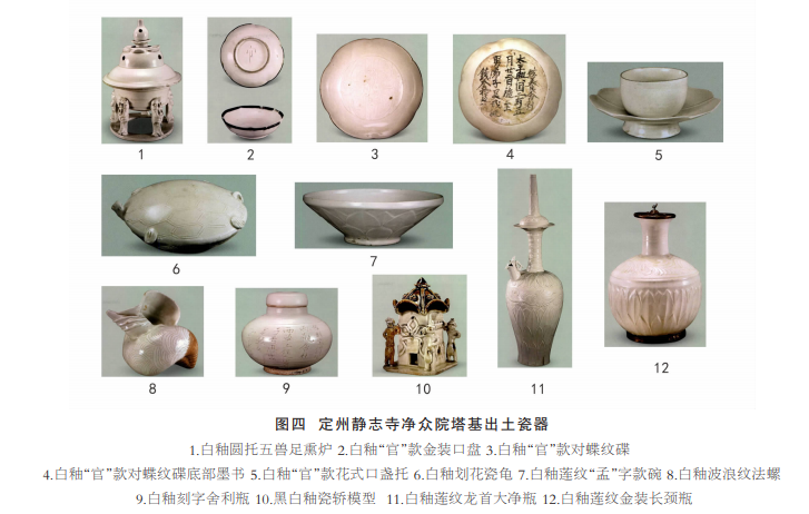 就瓷器而言,靜志地宮入藏的160多件陶瓷器中,過去較為罕見的瓶、盒、罐、爐類器物竟多達60件以上……靜志白瓷有“官”字款者十多件,其中一件有“新官”款……兩地宮的供奉瓷器多為官窯……當時定州官窯之生產其質量、數量並未降低,至少還保持着晚唐的水平。