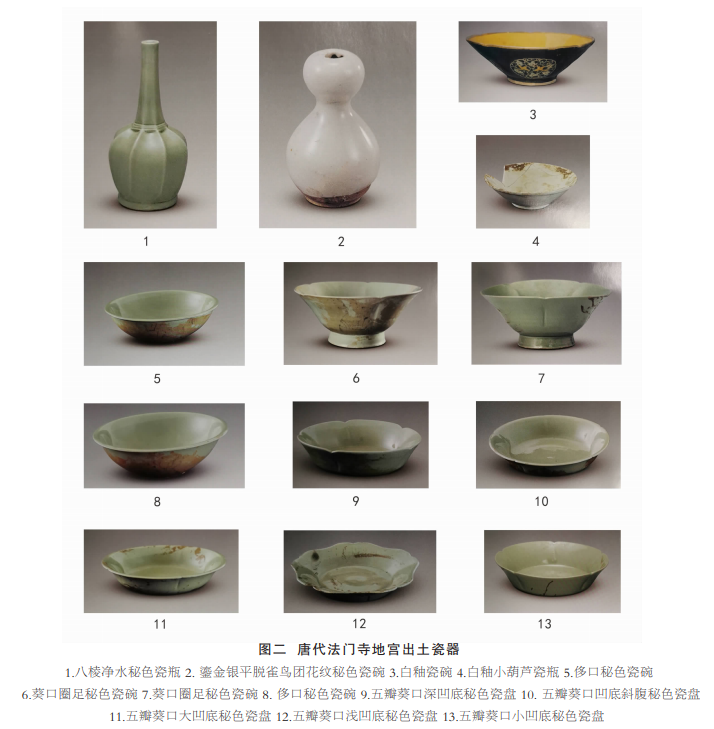 這些塔的時代主要是盛唐中期以後到唐代晚期。以法門寺塔基地宮發現的瓷器水平最高,共16件,其中有秘色瓷14件,瓶1件(圖二:1)、碗5件(圖二:5~8)、盤6件(圖二:9~13)、金銀平脱瓷碗2件(圖二:2),白瓷葫蘆瓶(圖二:3)、白瓷碗(圖二:4)。這些秘色瓷潔淨瑩潤、釉薄而均勻、胎色淺灰、堅緻細密、器形規整。其在《應從重真寺隨真身供養道具及恩賜金銀器物寶函等並新恩賜到金銀寶器衣物帳》碑中明確記載為“秘色瓷”。
