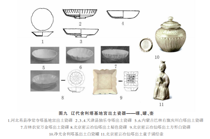 遼代發現瓷器的塔基地宮和天宮有遼代北京順義縣淨光舍利塔基地宮(遼早期約相當於五代晚期),天津薊縣獨樂寺塔覆缽內(上層塔室)和十三相輪底部(遼統和四年,986年),北京密雲冶仙塔基地宮(遼聖宗開泰年間,1012~1021年),河北易縣淨覺寺塔基地宮(遼天慶五年,1115年),內蒙古巴林右旗慶州白塔塔剎(遼重熙十六年,1047年),遼寧朝陽北塔天宮、地宮(遼重熙年間,1032~1055年),吉林農安萬金塔基地宮(不早於遼聖宗時期,982~1030),北京房山縣北鄭村遼塔地宮石函(不早於遼興宗時期,1031~1054)等。主要有影青瓷和白瓷,器形主要有瓶、罐、盤、碗、碟、盞託、燻爐、墜。