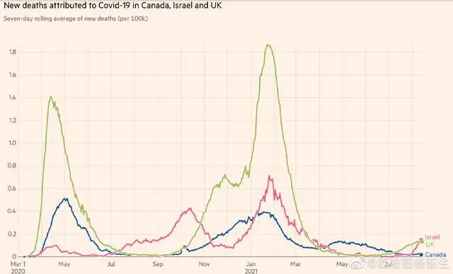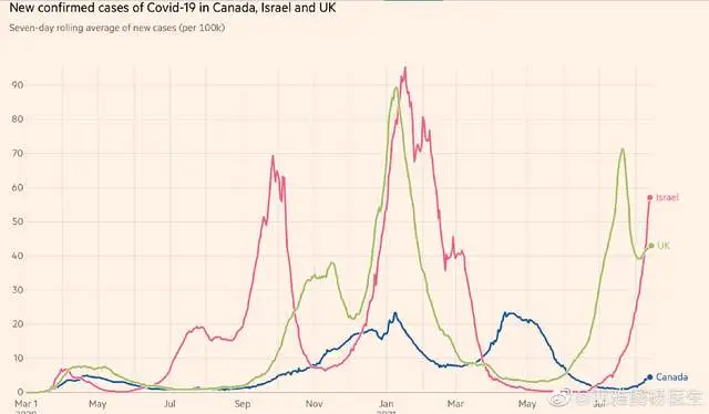下圖裏:以色列是紫紅色、英國是黃色,而加拿大是藍色。這是一個每7天的「每10萬人新增病例數」的時間趨勢圖。