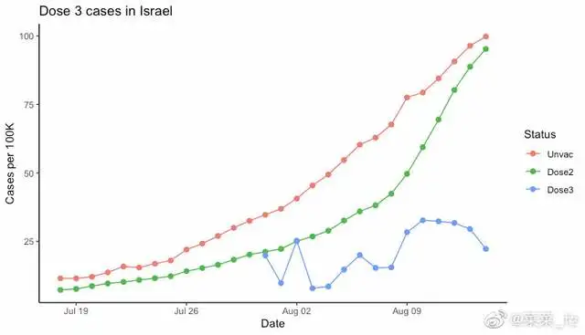 而下圖是以色列的隨時間推移的感染率對比圖:紅線是未接種人羣;綠線是接種2劑疫苗;藍線是接種3劑疫苗。