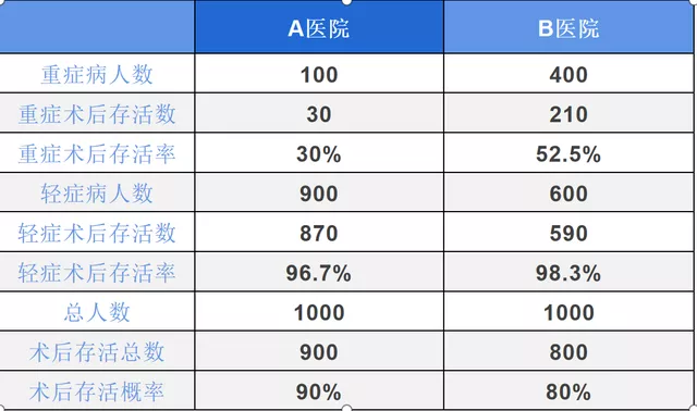 B 院有1000 名患者也做了同樣的手術,術後 800 人存活(總存活率 80%)。