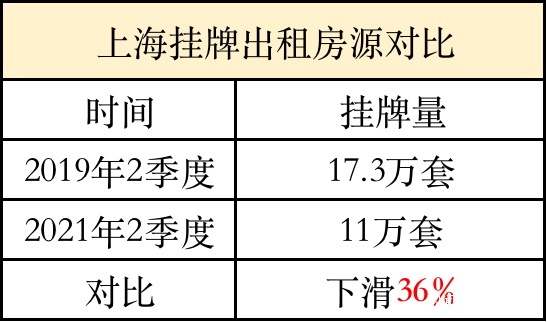 數據顯示,2021年第二季度上海掛牌出租房源是11萬套。而在兩年前,2019年的第二季度,當時的掛牌出租房源是17.3萬套。兩年間少了6.3萬套,掛牌出租房源減少了36%。