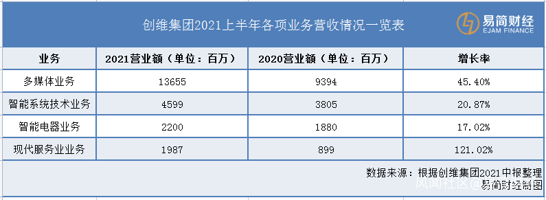 8月27日,創維集團公佈了中報成績單。截至2021年6月30日,創維集團營業額225.67億元,較去年同期增長41.2%。 分解到各項業務全面開花,多媒體業務、智能系統技術業務、智能電器業務、現代服務業業務,均收穫不同程度的增長。