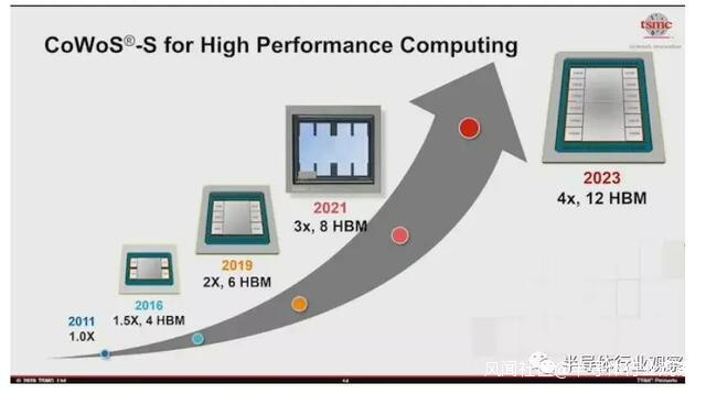 大家都熟悉的是CoWoS, S代表Silicon Interposer。通常是在65 nm 的製程中製造,因為是一整塊的單晶片,所以必須以同樣的方式製造,隨着我們進入小芯片的時代,需要有更多的芯片集成所以轉接板的尺寸越來越大,但是受到掩模版尺寸的限制,所以台積電研發出了大於掩模版尺寸的技術,根據他的路線圖道2023年,這些轉接板的尺寸將四倍於掩模版。