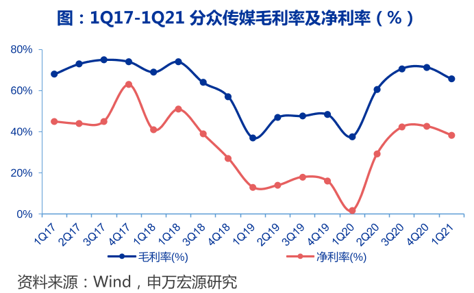 2015年9月,分眾傳媒借殼七喜控股完成回A上市,享受了中美兩地股票市場的估值差。從2015年至2017年,分眾傳媒的毛利率維持在70%以上的超高水平,2018年由於新潮傳媒低價爭奪下沉市場的影響,毛利率呈現下滑,2019年下滑至45.21%。但在新冠疫情衝擊下,新潮傳媒陷入裁員、降薪的求生風波,這使分眾傳媒在2020年的毛利率回升至63.24%。截至今年二季度,分眾傳媒的毛利率定格為66.03%。