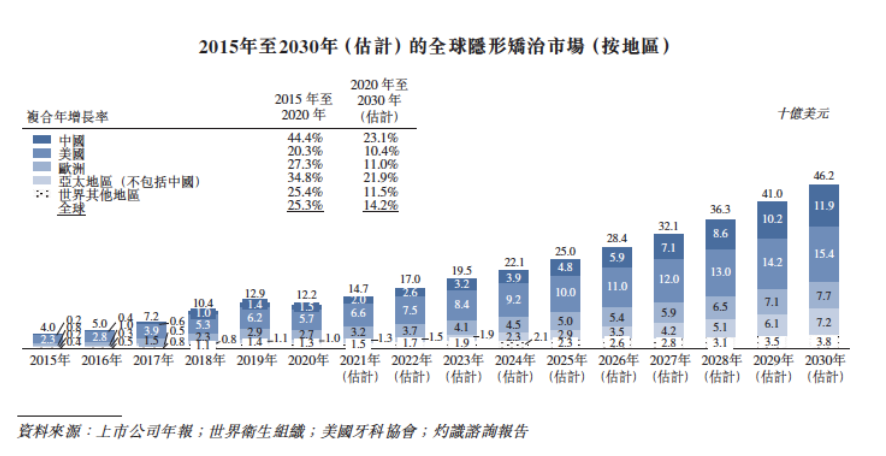 加之,中國口腔正畸市場的擴大。據灼識諮詢數據顯示,全球的隱形正畸市場在2020年122億美元,預計到2030年達到462億美元。其中中國的隱形正畸市場以23.1%的增速增長,預計在2030年達到119億美元,佔全球市場的25.76%,成為全球第二大隱形正畸市場。