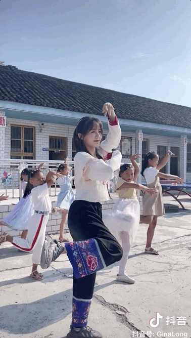 在短視頻裏,龍晶睛會將當下流行的音樂編成“國風舞”教給孩子,也會在田野裏舉行合唱比賽、朗誦詩歌,天邊的雲、田間的風、河邊的青青草地都是她的課題。