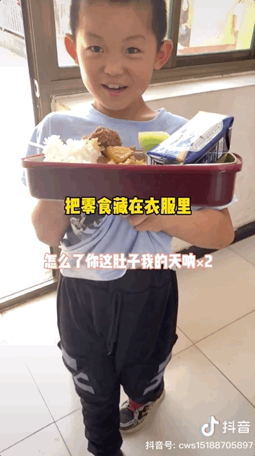 視頻中,女孩要把學校發的雞腿帶回家給媽媽,站在一旁的張鵬程説:“你吃吧!我再給你拿個雞腿。”