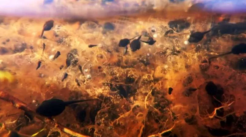 入侵蝌蚪聚集在卵帶周圍,正在捕食剛孵化出來的本土蝌蚪
