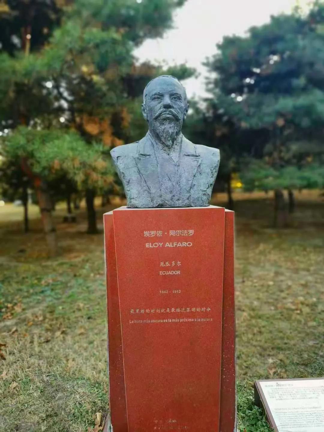 雕像基座上用中西雙語刻着一句話:“最黑暗的時刻就是最接近黎明的時分。”