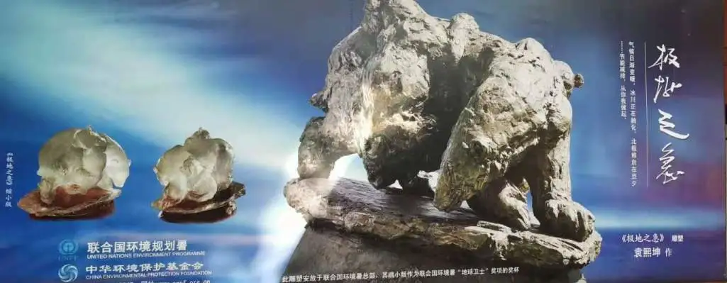 大廳的東西兩側各懸掛巨幅雕塑《極地之急——北極熊》和《女媧補天》的照片和介紹。據譚老師介紹,這都是袁先生熱衷於環保事業的見證。他以極大的熱情投入到環保題材藝術品的創作中,曾被聯合國環境規劃署授予“環保藝術大師”稱號。
