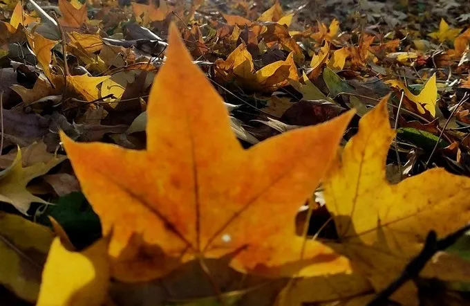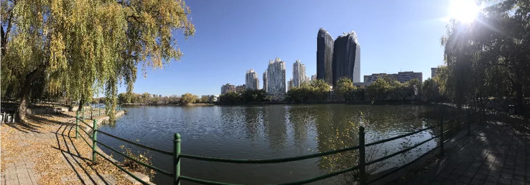 沿着佈滿紅色楓葉與金色銀杏葉的蜿蜒小路繼續前行,頓覺豁然開朗——波光粼粼、柳葉撫面的景象呈現於眼前。從地圖上看,這就是水碓湖無疑了!(朝陽公園原名水碓子公園)