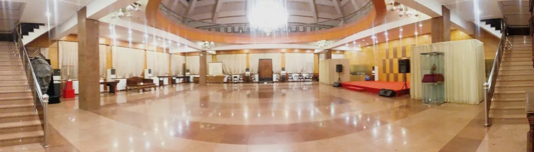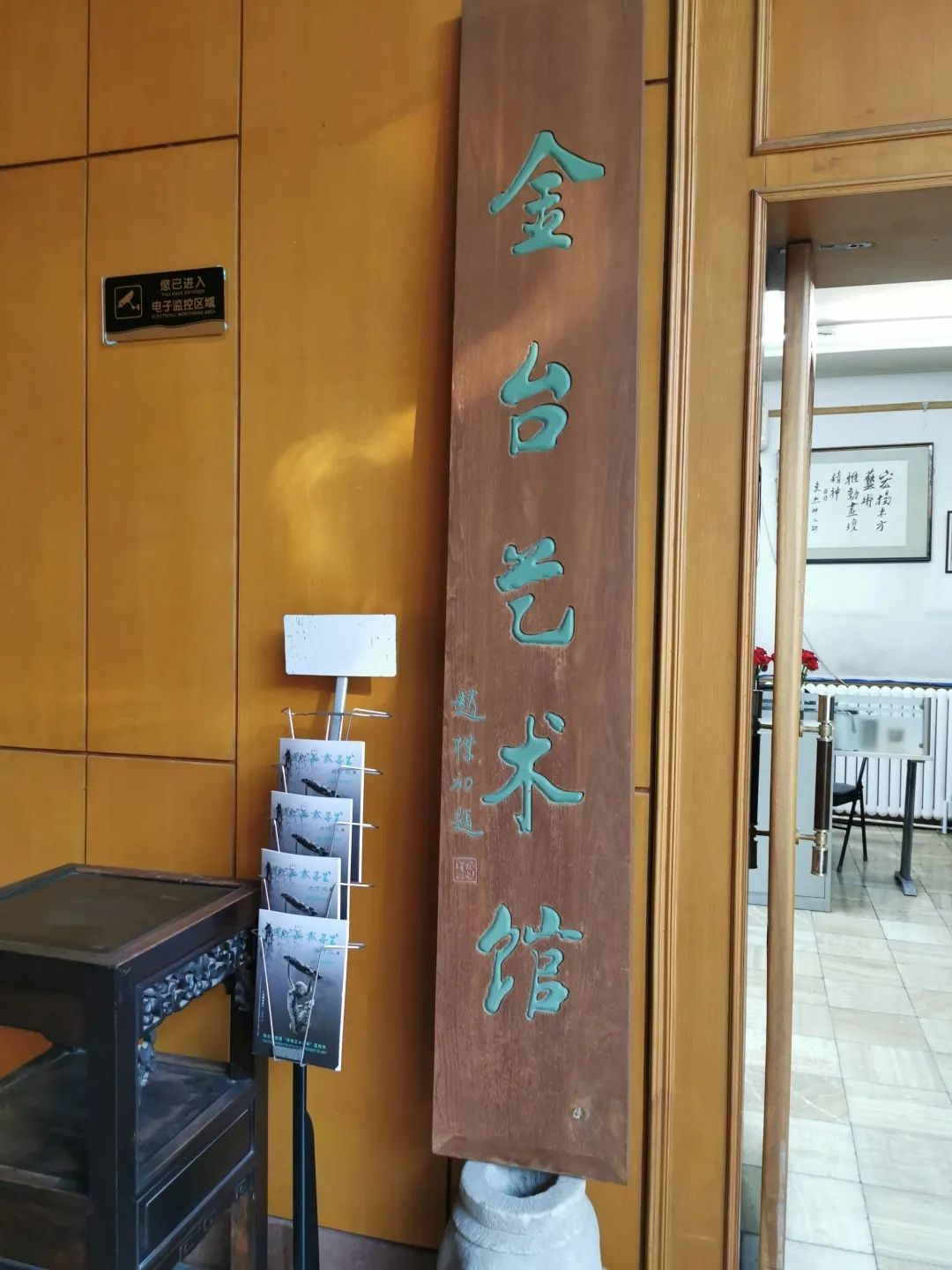一行人魚貫來到藝術館一樓大廳,迎面擺放着中國現代社會活動家趙樸初先生題寫的“金台藝術館”匾額,格外醒目。