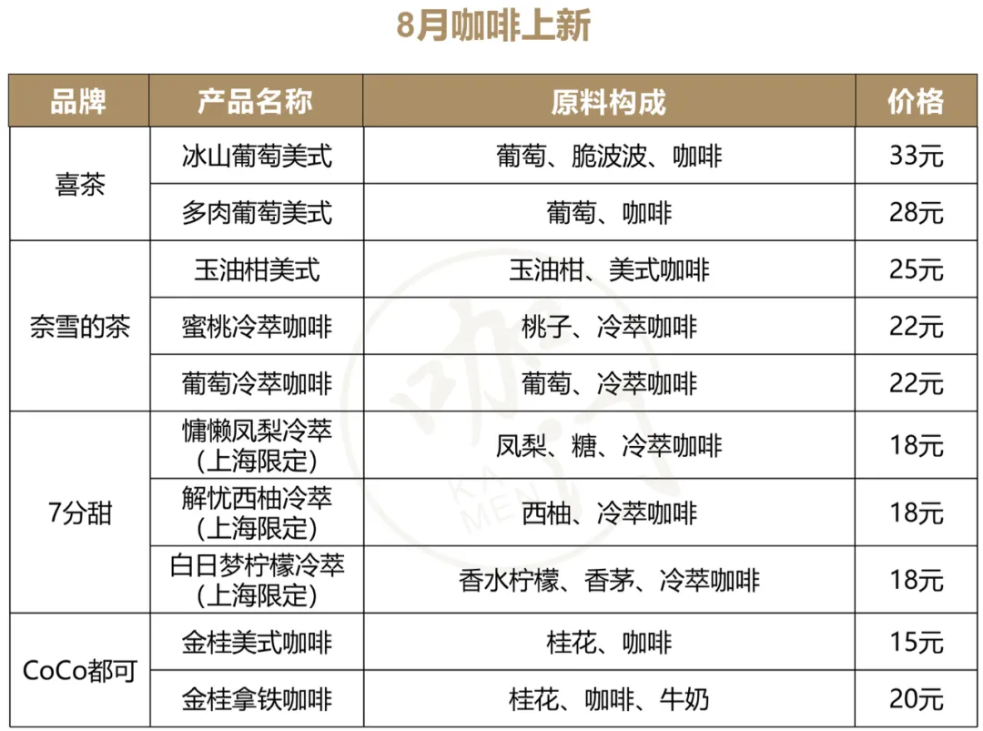 **8月,共有4個茶飲品牌推出咖啡:**喜茶、奈雪的茶、7分甜、CoCo都可,產品價格在15~33元區間;其中價格最低的是CoCo的金桂美式咖啡,15元;價格最高則為喜茶的冰山葡萄美式,價格33元。