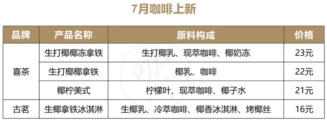 **7月,也有2個茶飲品牌推出咖啡:**喜茶上新3款生打椰咖啡,古茗推出1款生椰拿鐵冰淇淋。