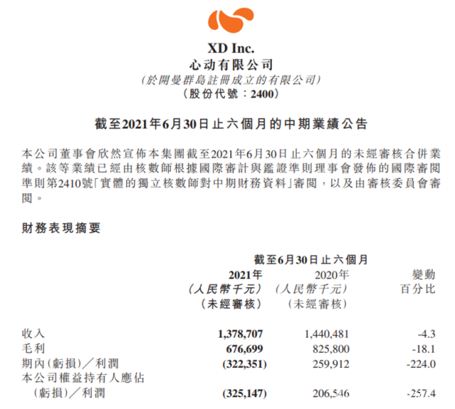 26日,心動公司(以下簡稱心動)發佈了2021年的中期業績。期內收入13.8億,期內利潤-3.2億。