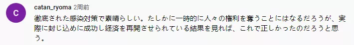 徹底的防疫對策很棒。雖然是暫時的限制自由,但從經濟得以重啓的結果來看,我認為這是對的。