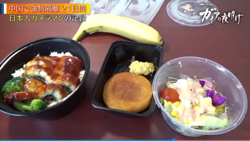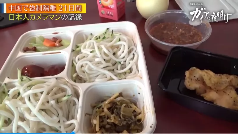 第一餐的隔離餐是北京炸醬麪,有菜有肉,挺豐盛的,這有着一層歡迎外賓的含義吧。中村一開始以為是烏冬,嚐了一口:**“有點酸,有點甜,好吃”。**第一頓隔離餐,完食。