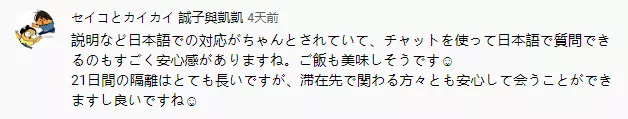 説明日文的對應很好,可以拿微信用日語求助這點讓人很安心,隔離餐看起來也很好吃。