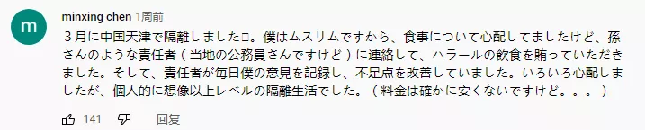 3月份的時候我在天津隔離,我是穆斯林的,對飲食這塊非常的擔心,不過也有像孫先生這樣的負責人跟我對應,給我提供了清真食物,在我的飲食上提供了很大的幫助,每天都會記下我的意見,不斷的完善我的飲食,雖然有很多的擔心,但是給到了我想象意外的隔離生活。