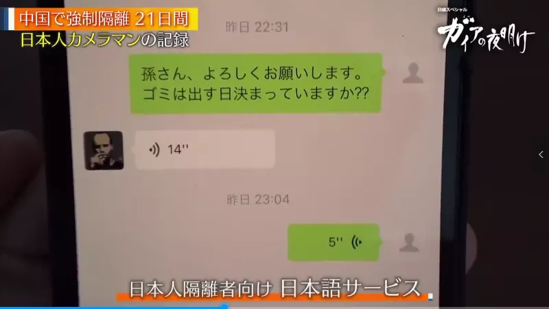 外籍隔離人員在隔離期間會有專門的隔離負責人對應。中村在意房間垃圾的處理問題,用微信聯繫了專門的負責人孫先生,孫先生用日語對應中村的一切問題。有關垃圾處理的問題,孫先生給到的回應是:**“有垃圾放在門口就可以了,每天扔都沒有問題。”**日本扔垃圾一般都有指定日期,每天都可以扔家庭生活垃圾對於日本人來説是比較新鮮的事情。