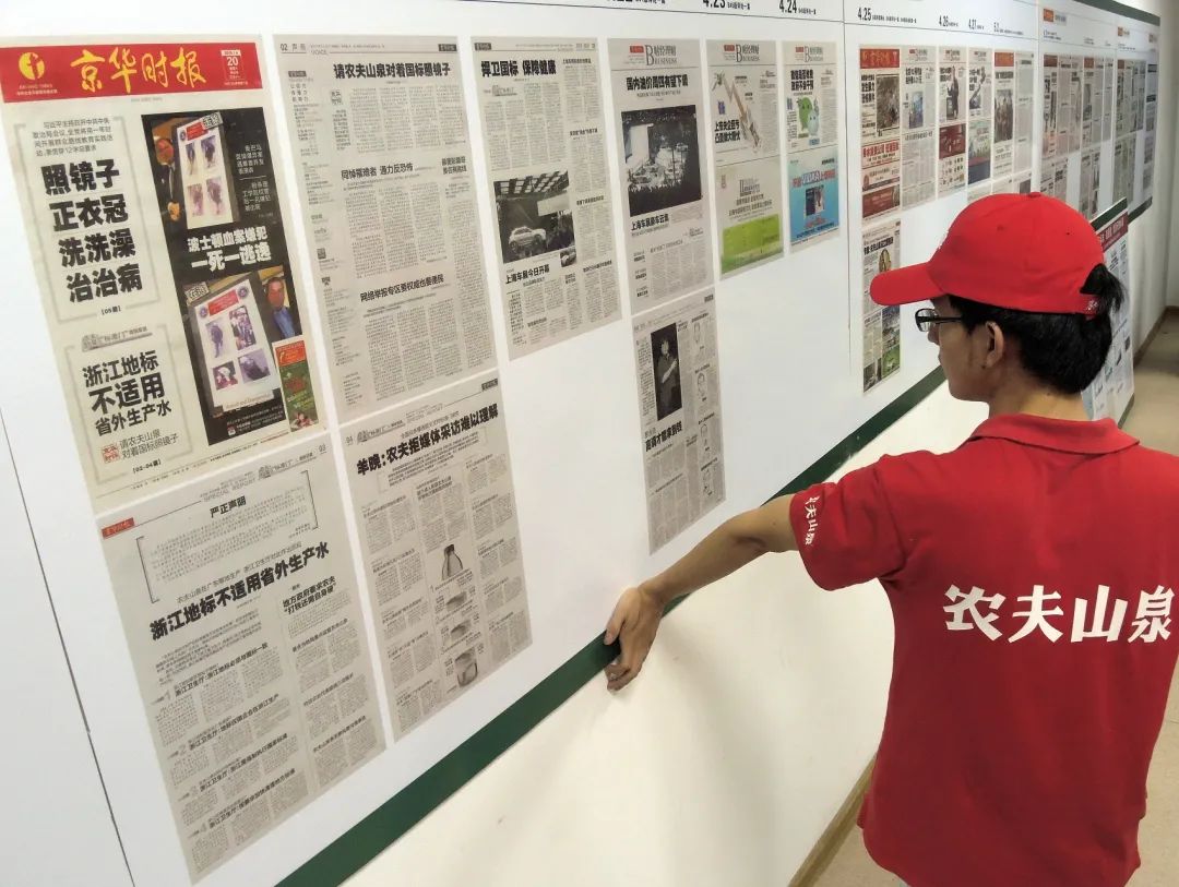 1998年投放“農夫山泉有點甜”廣告享譽全國後,農夫山泉成了央視常客。兩次水戰的開打,也讓全國的報紙成為農夫山泉廣告位。媒體出身的鐘睒睒,一手電視一手紙媒,把控着當時的輿論主陣地。