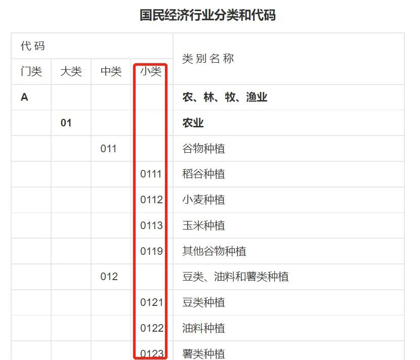 △該標準將國民經濟行業劃分為門類、大類、中類和小類四級。代碼由一位拉丁字母和四位阿拉伯數字組成,標紅的就是最小的分類。這些最小的分類經常會單獨出現在各種派生的產業分類中,各種產業分類也通過這種方式與《國民經濟行業分類》構建起從屬關係