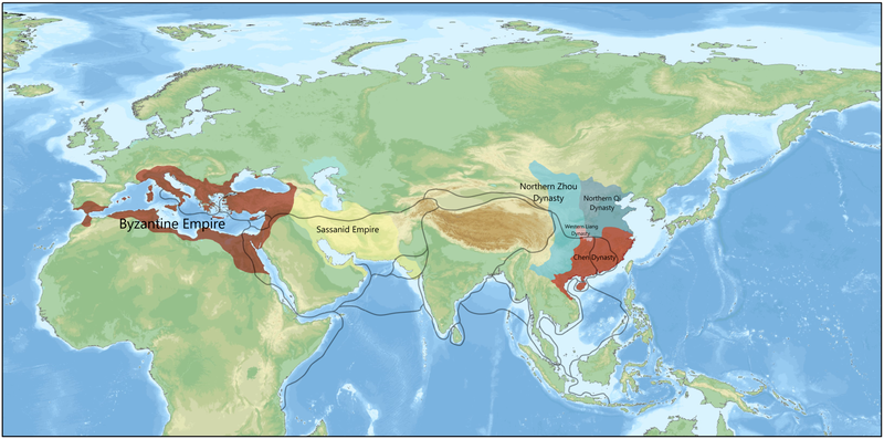 南北朝時期拜占庭和中國之間的絲綢之路。費爾干納是絲綢之路上的重要一站。圖片來源:wikipedia