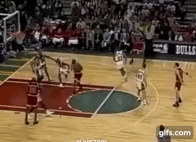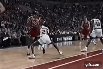 公牛第一次打停超音速,是喬丹一個右翼單挑:開場5投3中。