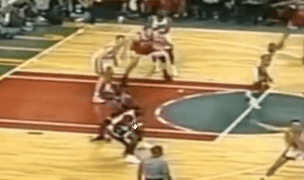 喬丹開場就果斷進攻,各色跳投。用掩護擋開史萊姆夫,用急停跳投針對霍金斯。佩頓也試圖防過喬丹,但這球最明顯: