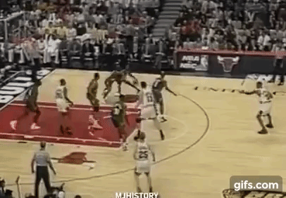 很明顯的一球:喬丹背打佩頓時,超音速不想提前夾擊,只在喬丹眼看要拱向內線時才收縮,但也夠喬丹翻身跳投得手了。佩頓干擾不了喬丹出手。