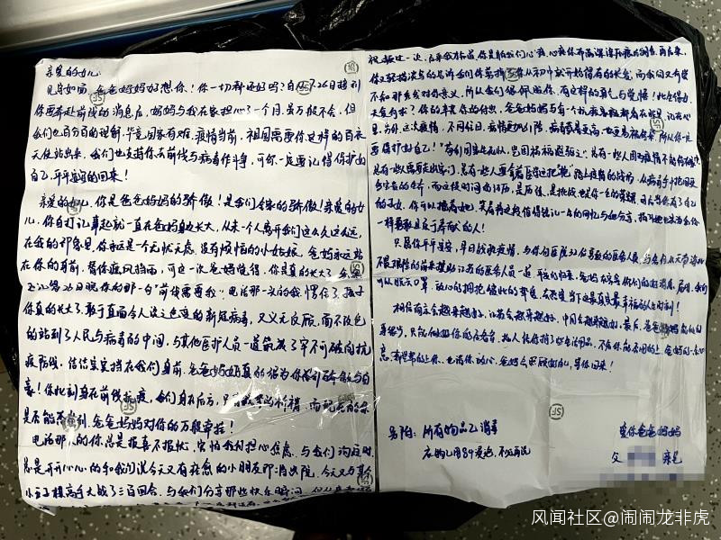 南京市兒童醫院為保證該院駐南京市公共衞生醫療中心醫療隊的日常用需,每週會安排車輛為醫療隊運送防疫物資和生活物資。近日,醫院收到了一個用黑色袋子包裹嚴實的箱子,上面整整齊齊地用膠帶貼着一封寫滿了字的家書。平平淡淡的家長裏短,樸實無華的瑣碎言語,字裏行間卻滲透着豐富的情感,有“女兒已經長大”的欣慰,有身為抗疫英雄父母的驕傲和自豪,還有父母對兒女深深的牽掛……紙短情長,細細讀來,讓人不禁眼角濕潤,心中似有暖流湧動。