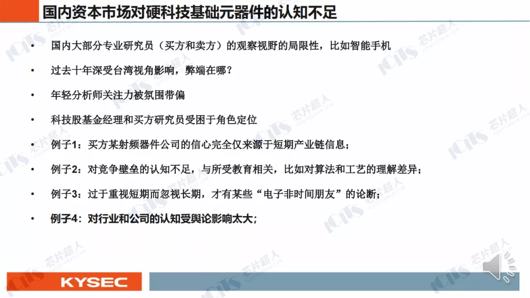 其實國內資本市場以前對硬科技、基礎元器件的認知是不足的,這時往往會有一些價值的錯配。但隨着中美貿易摩擦的加劇,大家越來越認識到這部分的重要性,這部分是一個被低估的領域,它的價值會逐漸被重估。這是我在科技領域給大家的一些建議,也就是説,如果你在這個領域,應該不會被虧待。