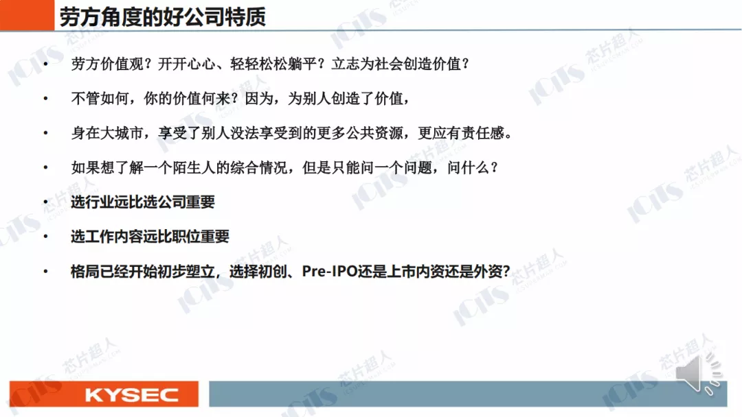 半導體行業,或者説集成電路行業,它的格局已經初步樹立。這個時候,你應該選的是初創型還是Pre-IPO企業,已經上市的內資企業,或是外資企業,這個很大程度跟你個人的經歷或者資源有關係,還與你對事物的追求有一定的關係。
