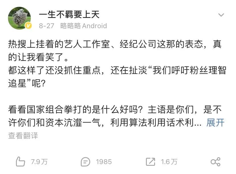 正如微博博主@一生不羈要上天 一針見血指出的:“熱搜上掛着的藝人工作室、經紀公司這那的表態,真的讓我看笑了。國家要打的從來不是‘粉圈’,而是利用粉絲形成了圈層文化的你們。”這時候仍然想矇混過關,試圖通過與“飯圈”切割洗清責任,説明飯圈的始作俑者尚未意識到問題的嚴重性,也不想在“飯圈經濟”之外另謀出路。
