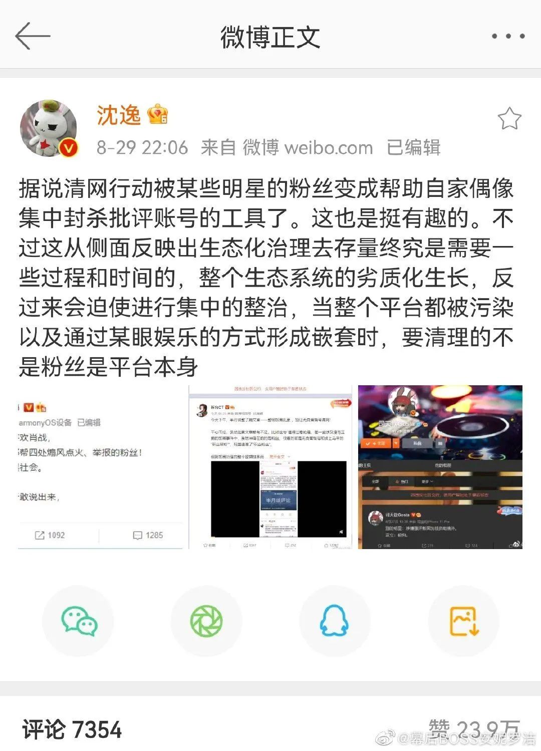“據説清網行動被某些明星的粉絲變成幫助自家偶像集中封殺批評賬號的工具了。”正如微博博主@沈逸 所觀察到的,“尚方寶劍”反而成為部分明星粉絲威脅所謂“黑粉”的手段(“粉絲的誤區在於,一聽見説整頓粉圈,就認為是收拾自己對家和黑的好機會”)。在官方媒體發佈的整治飯圈的口號之下,也依舊是整齊劃一的粉絲控評,要求整治“黑號”,多多少少有種黑色幽默的味道。