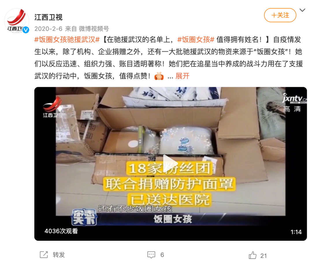 飯圈文化在公共視野中不只有破壞性的一面。在一些涉及國家利益、社會公益的事件中,飯圈曾經因為極強的凝聚力和團結力,釋放出了令官方、民間一起點讚的正能量。“飯圈女孩馳援武漢”“飯圈出征”等都曾經是她們的高光時刻(飯圈女孩“武漢救援”實錄)。