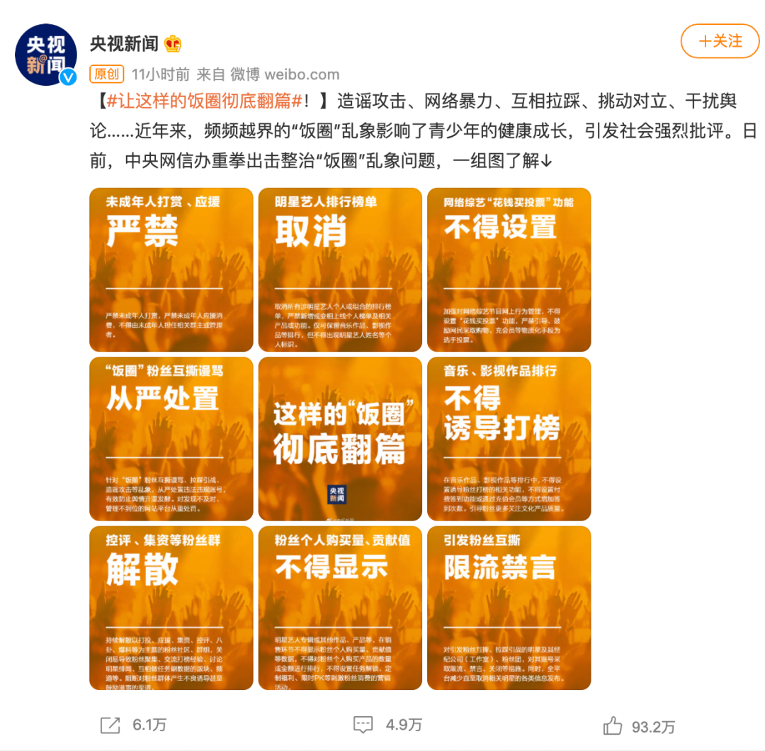 近幾年來監管部門曾屢屢對飯圈亂象出手,2018年1月和2020年6月,網信辦兩次勒令微博下線整改熱搜、熱話榜。2020年9月,網信辦點名六家誘導未成年人大額消費、煽動粉絲互撕謾罵的互聯網平台,然而這些時不時的“敲敲打打”都未能遏制飯圈“妖風”越刮越盛。