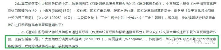 之前國家新聞出版署發佈的政策中,定義的網絡遊戲包括:大型角色扮演類網絡遊戲(MMORPG)、網頁遊戲(Webgame)、休閒遊戲,單機遊戲的網上下載,具有聯網功能的遊戲,聯網的對戰遊戲平台,手機網絡遊戲。