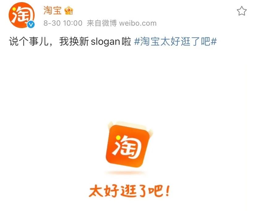 當我這樣一箇中年人,兢兢業業逛了一下午淘寶,覺得自己重新掌握了年輕人的脈動,再度獲得了一些寶貴的安全感之後,跳出淘寶刷了刷微博,自信心再度受到重創,淘寶這貨,正在微博上官宣自己換了slogan。
