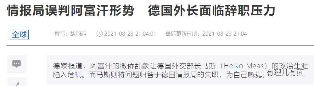 德國外交部長馬斯表示,阿富汗機場亂局的根源是聯邦情報局。而馬斯的前任加布里爾在接受西德意志電台採訪時稱,“這不是德國外交部長一個人的問題,而是整個北約的醜聞”。