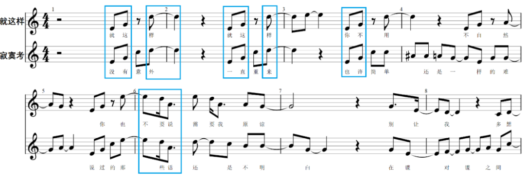 可以看出,只有第三小節和第五小節前半部分的旋律是完全相同的,其他的部分則沒有在相同位置產生非常高的雷同。