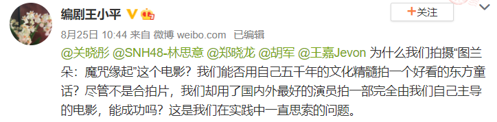 不過,《圖蘭朵:魔咒緣起》雖然與《阿修羅》等影片高度形似,背後故事卻並不相同。它的編導陣容不是好萊塢路人甲或赤膊上陣的國產土豪,而是資深影視從業者鄭曉龍、王小平夫婦,第一齣品方也是與鄭曉龍深度綁定的花兒影視。