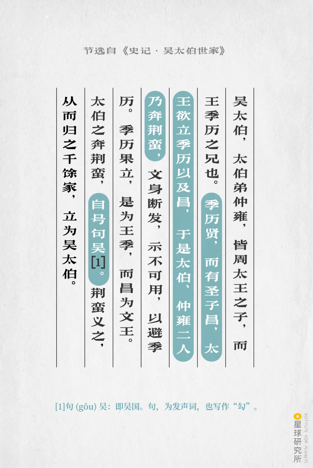 《史記•吳太伯世家》片段節選;文中的“太伯”即“泰伯” | 製圖@陳隨/星球研究所