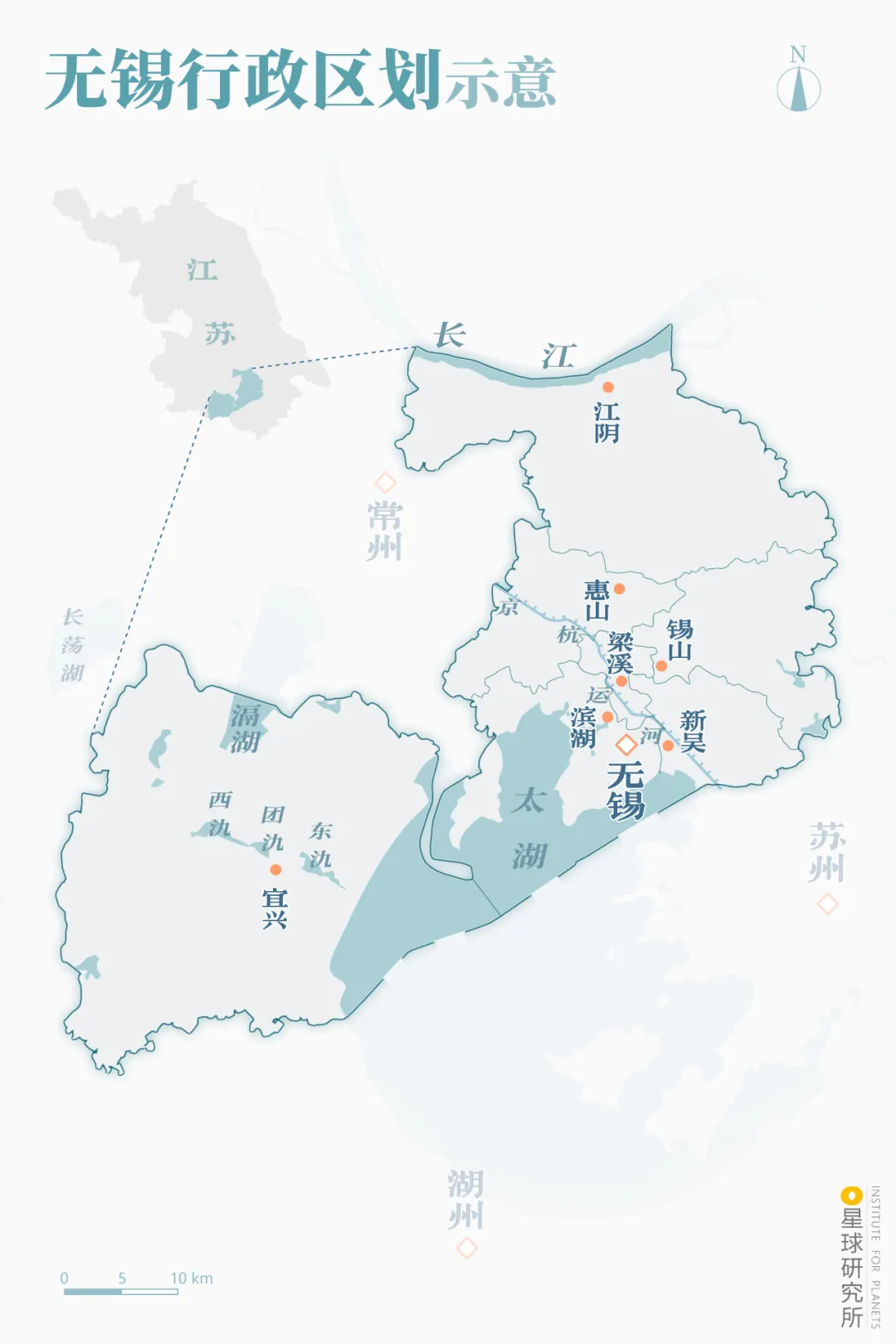 無錫行政區劃示意;江陰與宜興後改設為縣級市| 製圖@陳志浩&陳隨/星球研究所